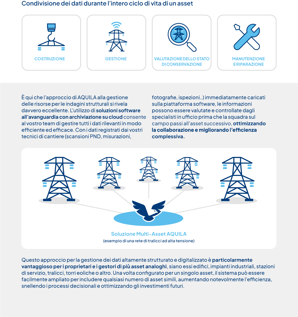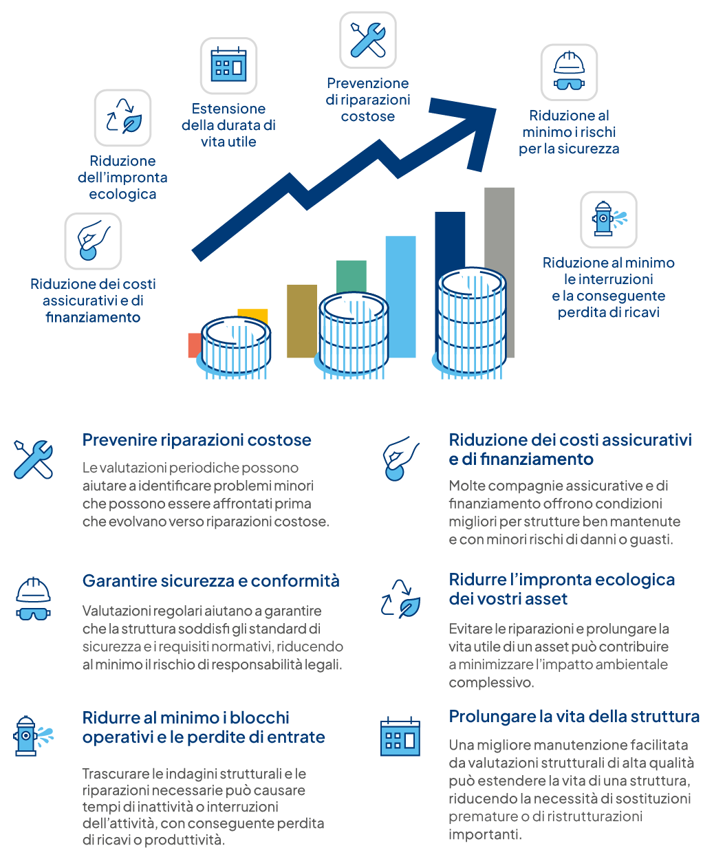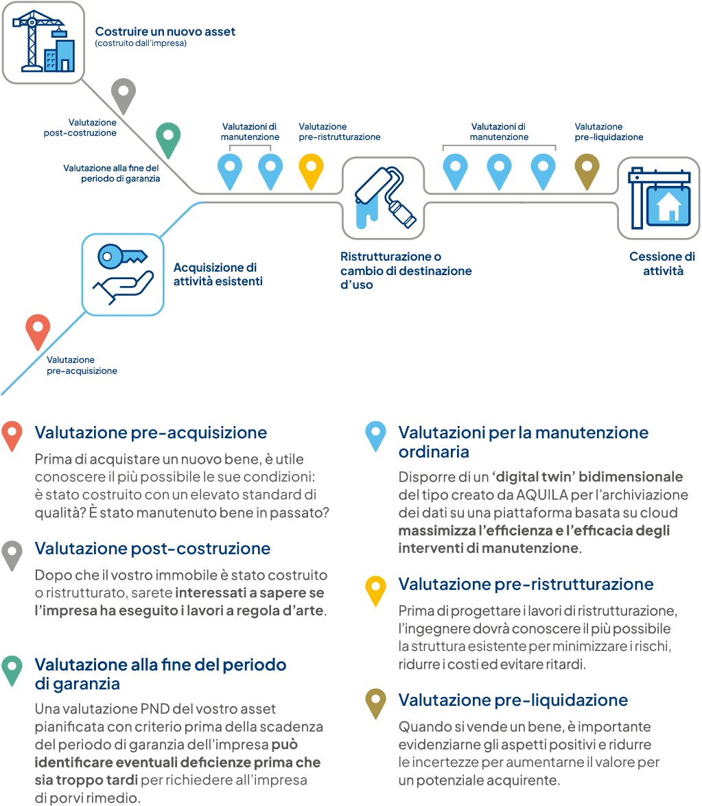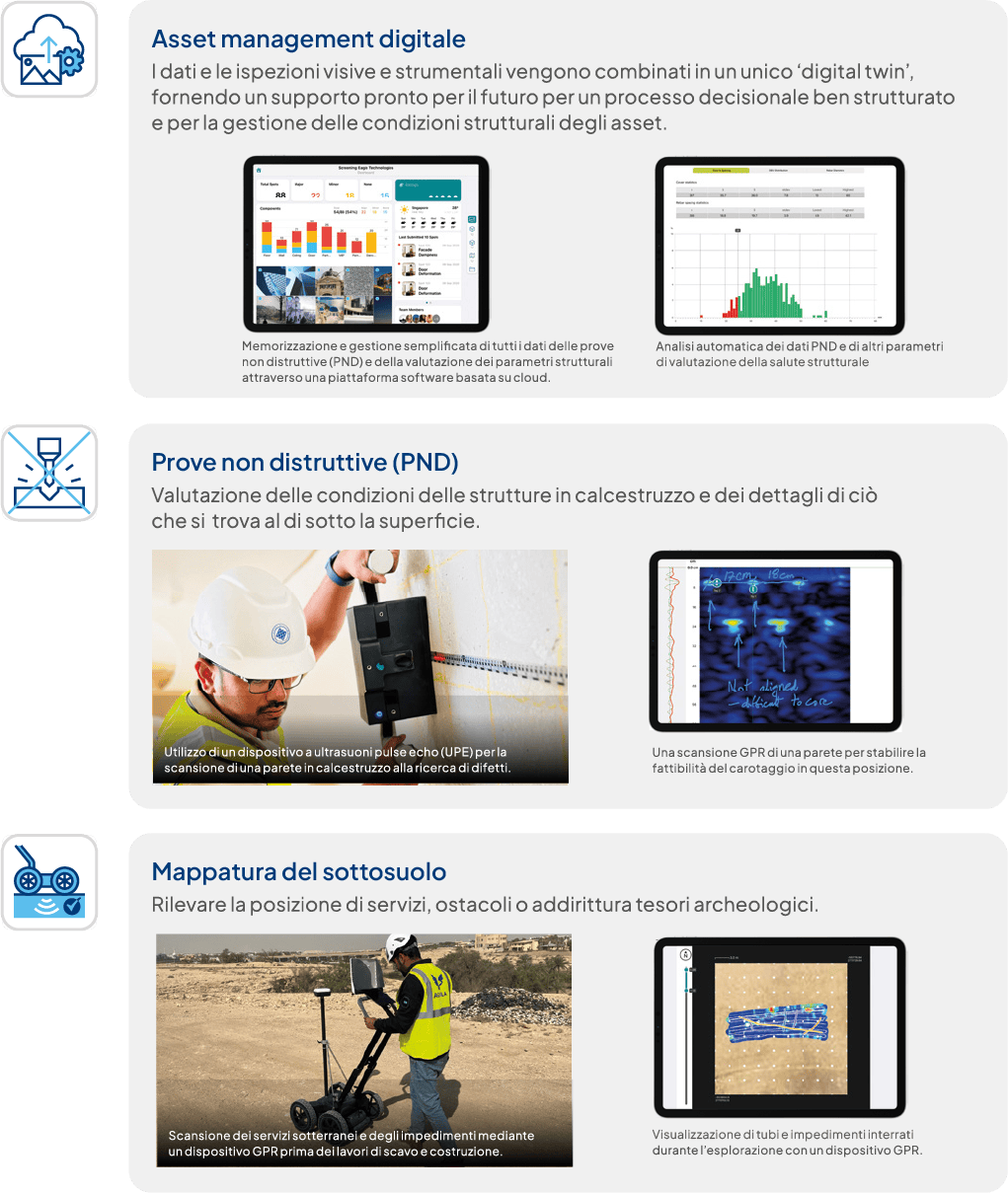 Le nostre soluzioni high-tech di valutazione strutturale con un approccio digitalizzato di ‘asset management’ aiutano a massimizzare le prestazioni dell’intero intero ciclo di vita ed a migliorarne la sostenibilità.