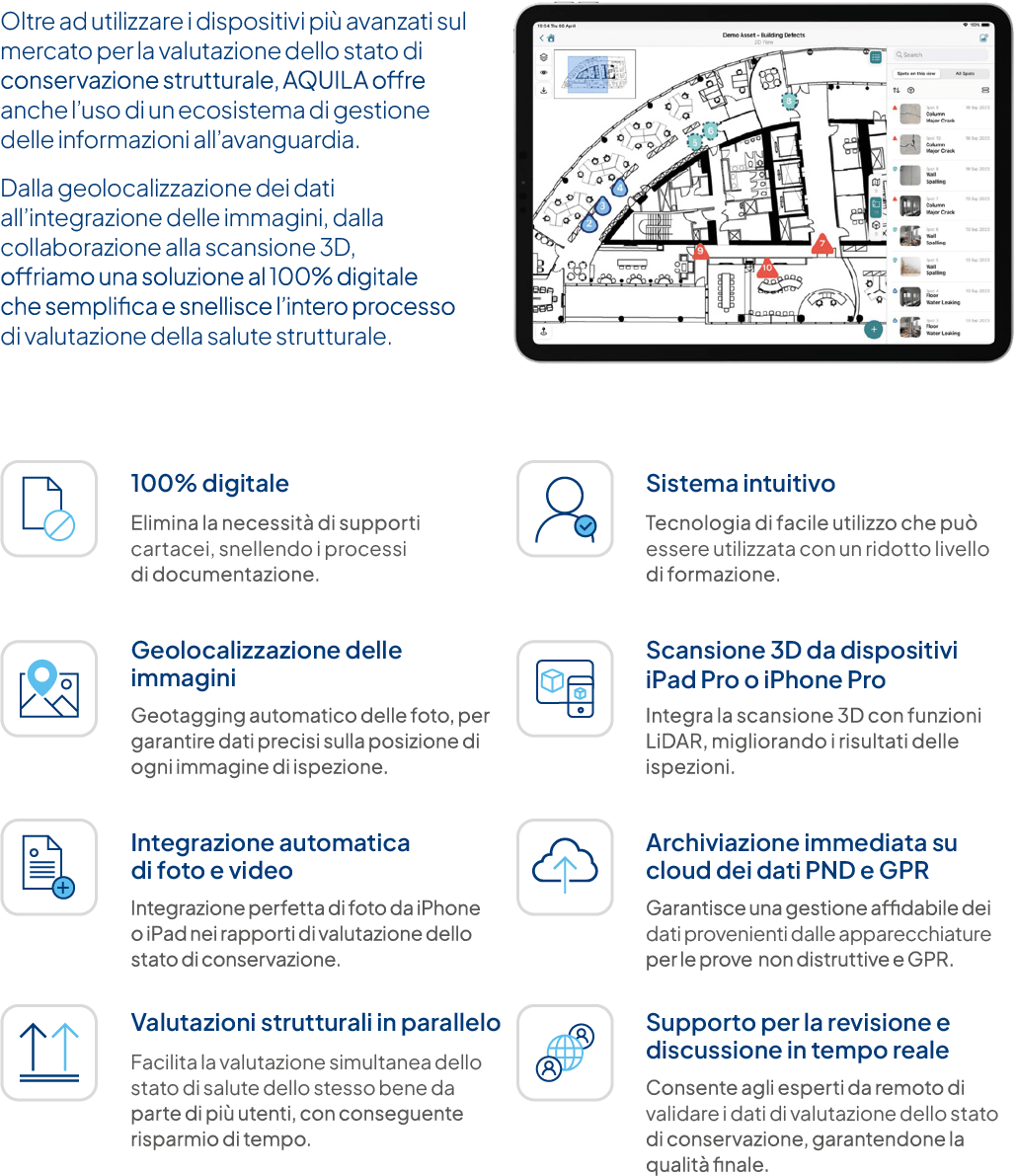 L’approccio high-tech di AQUILA all’asset management per le valutazioni strutturali e infrastrutturali, con tuttii dati e le registrazioni archiviati inuna piattaforma cloud appositamente sviluppata, è ecologico sotto diversi aspetti.