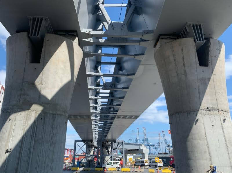 Le due corsie laterali sono state costruite per il traffico veicolare, mentre la corsia centrale è stata costruita per il passaggio del treno. Il primo tratto, da sp1 a P14, è in calcestruzzo ed ha campate tra i 41 ed i 62,5 metri. Il secondo tratto, in acciaio, prevede 9 campate con luci tra i 72 m ed i 105 m.
